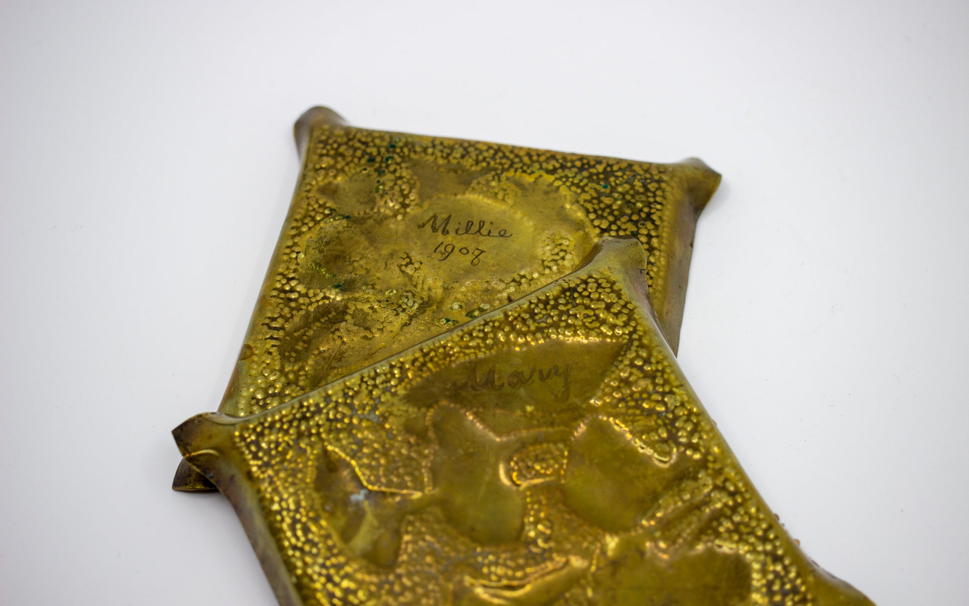 Beautiful Edwardian brass pin dishes inscribed on the underside "Millie 1908" and the other "Mary". UK sourced antique. 127g each and 11cm x 11cm