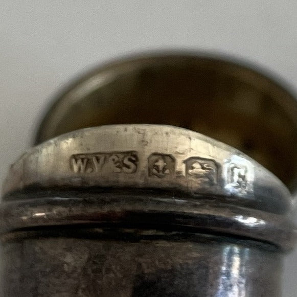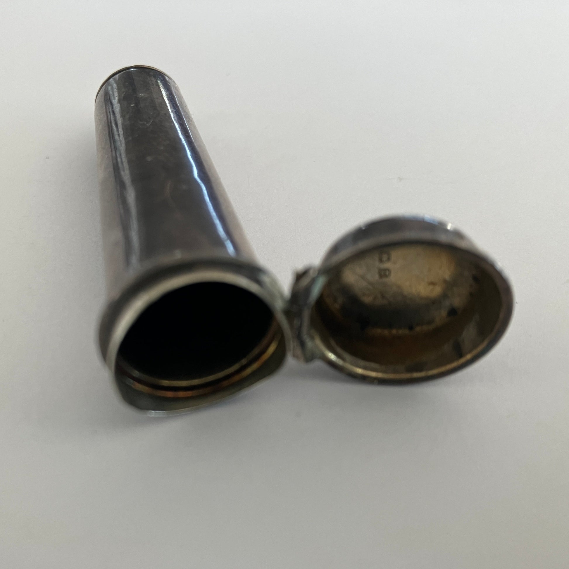Sterling silver needle case. Clearly hallmarked as per photos - W.V & S into an oblong chamfered rectangle (William Vale & Sons) date letter "r" for 1916, Anchor for Birmingham and Lion Passant. 5cm long, 6cm including the loop which is also stamped as sterling silver with just the lion passant. Lovely patina uncleaned. Lids closed firmly and hinge works well.